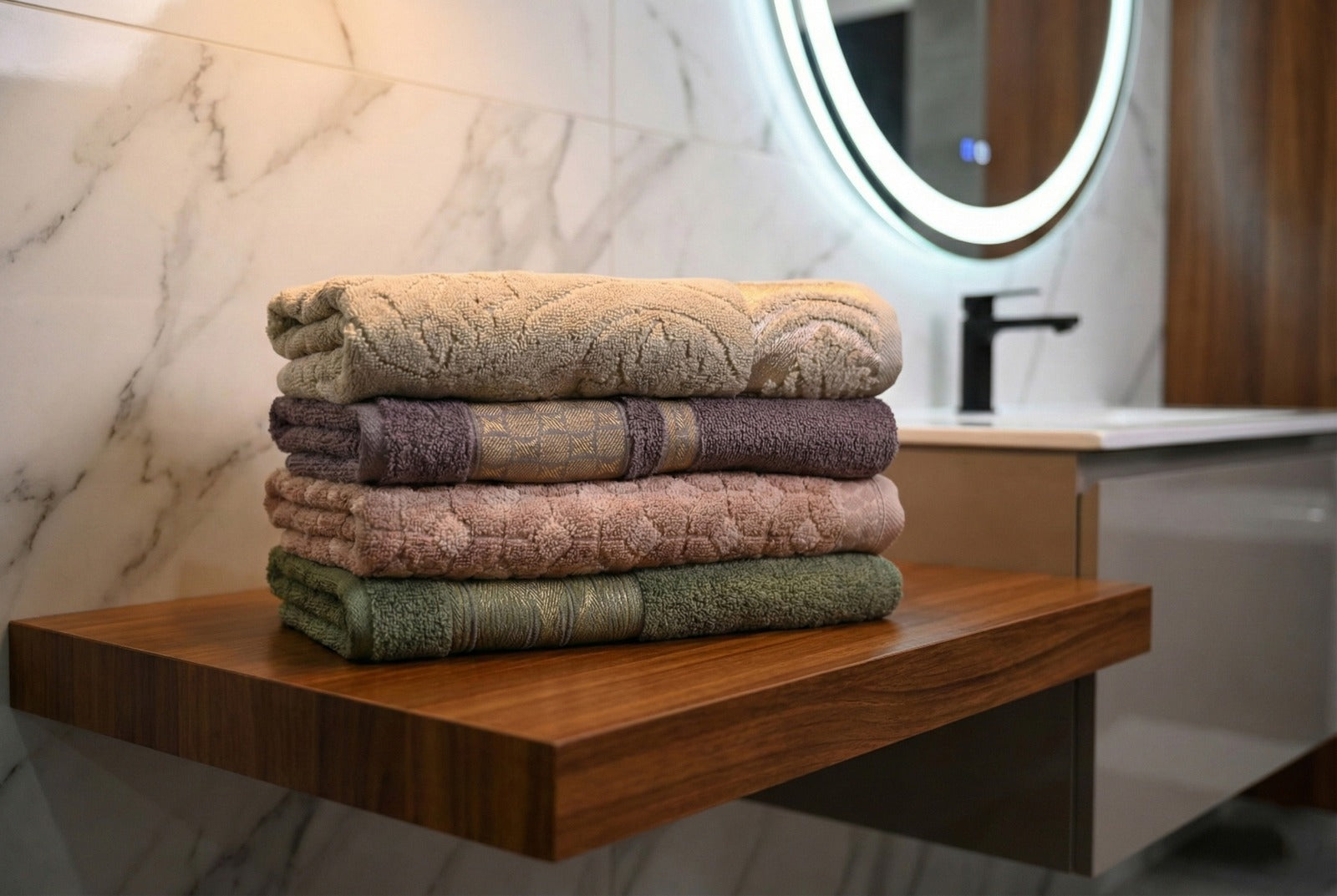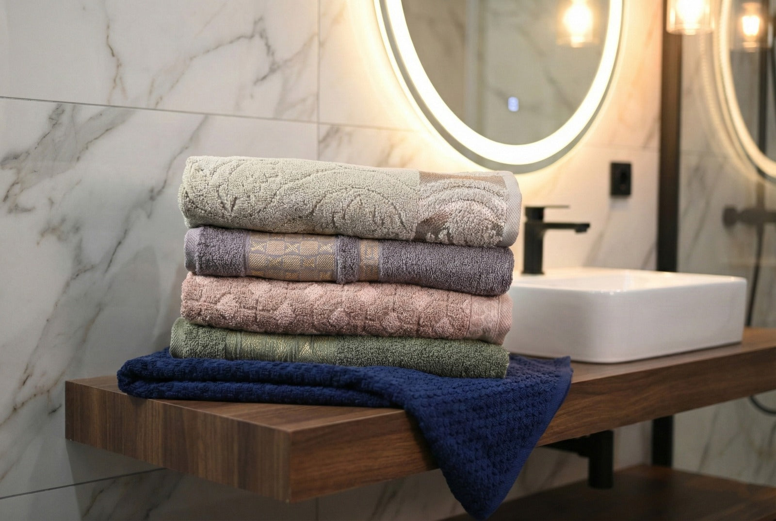 Indulge in classic comfort with this Premium Set of 5 pieces Authentic High-Loop Terry Jacquard bath towels, Sizes 50×90 – 50×100 – 70×140 cm, Code: SEM80.