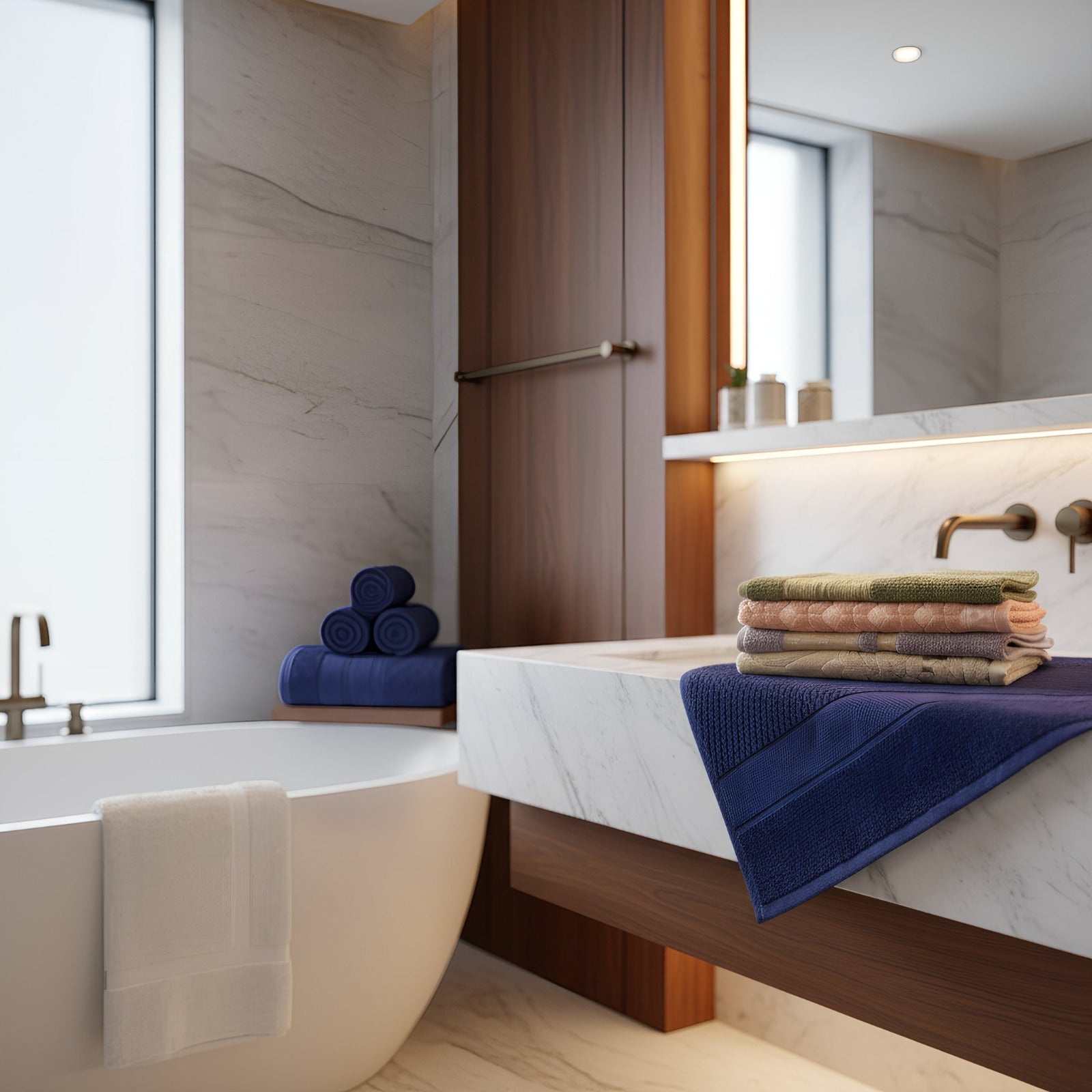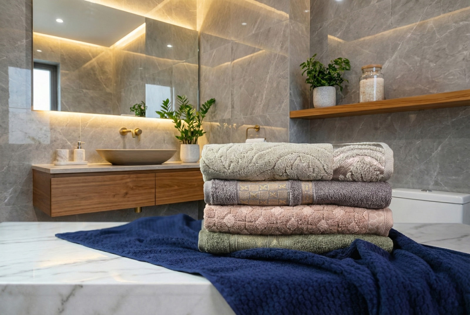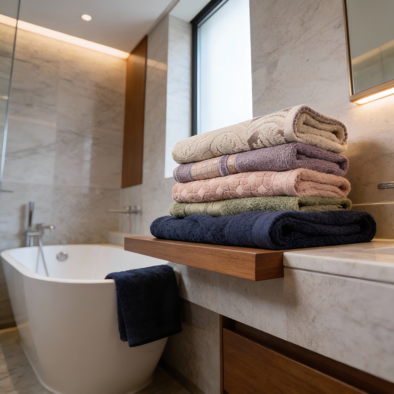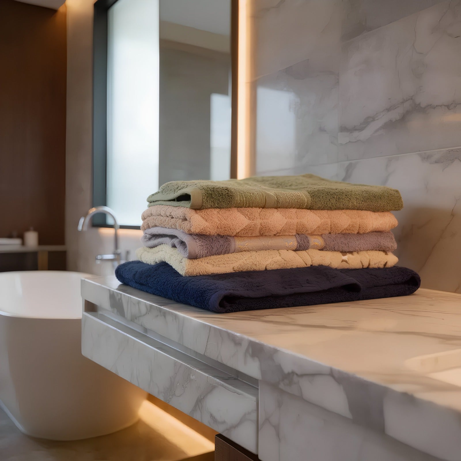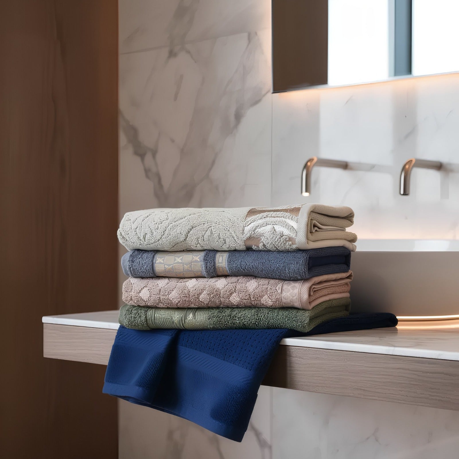 Experience timeless luxury with this premium 5-piece coordinated set, thoughtfully designed in a unique 4 + 1 configuration. It includes four versatile towels in 50x90 cm and 50x100 cm sizes, plus one generous 70x140 cm signature piece for full-body coverage. Crafted from authentic High-Loop Terry with elegant Jacquard weaving, the set features a refined palette of Deep Navy, Warm Cream, Soft Lavender, Peach, and Sage Green for a cohesive, heritage-inspired look.