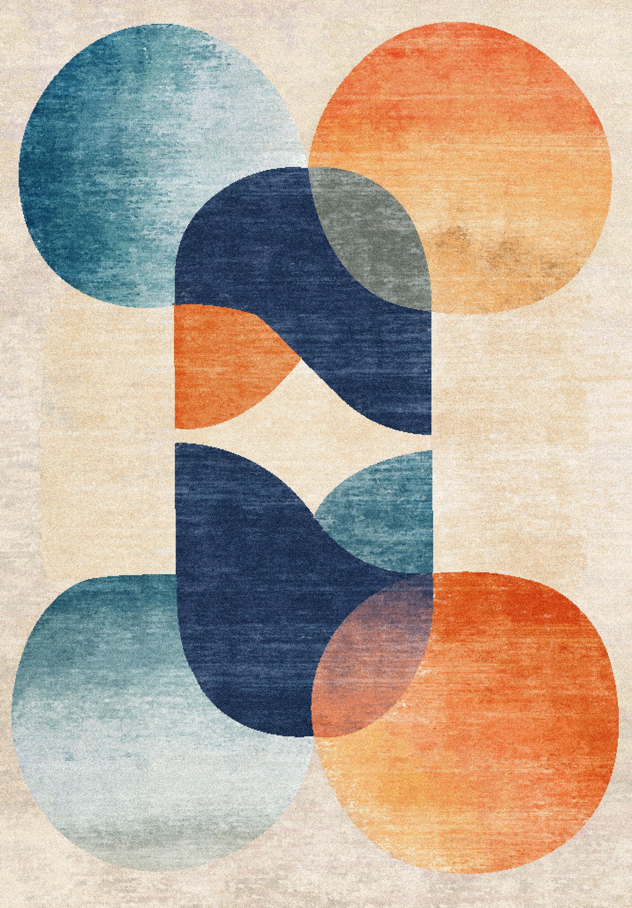 Product Description Make a striking contemporary statement with our Orbital Echo Modern Rug. This artistic piece features a bold, abstract geometric pattern composed of overlapping circles and ovals, creating a dynamic visual flow. The palette is both vibrant and balanced, showcasing rich tones of deep navy blue and cool teal, dramatically complemented by warm, fiery terracotta and burnt orange accents, all set against a soft, neutral sand beige background. Crafted with a soft, dense pile, this rug is a unique work of floor art that adds movement, depth, and a vibrant modern energy to any space.