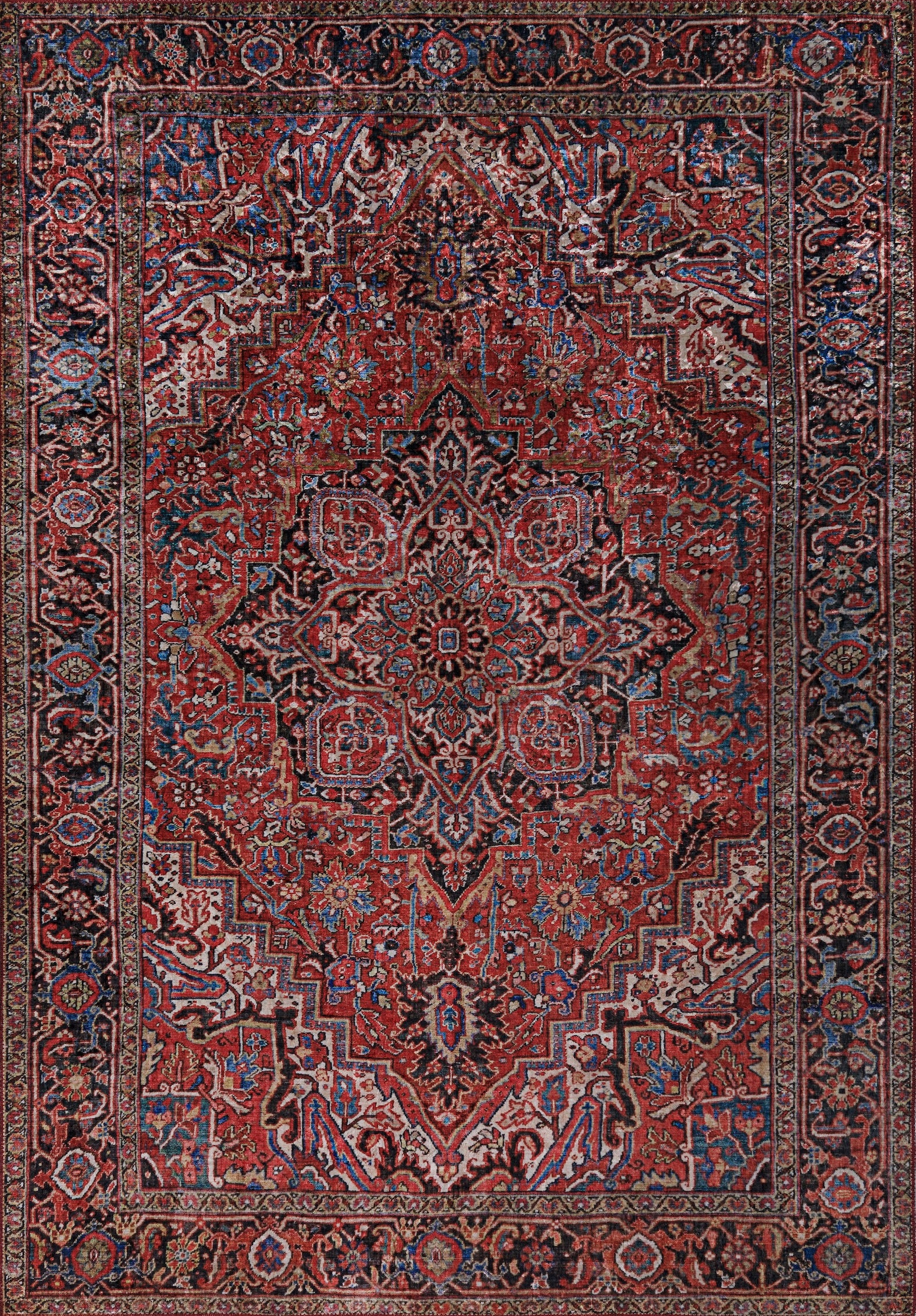 Product Description Anchor your space with the timeless grandeur of our Classic Red Persian Medallion Rug. This majestic piece features a highly detailed, commanding central medallion surrounded by an intricate all-over floral and vine pattern. The pattern is expertly framed by a multi-layered, ornate border. The dominant color is a saturated, traditional deep rust red or terracotta, providing a rich, warm foundation. The intricate motifs are highlighted in contrasting colors, including navy blue, black, cream, and touches of pale gold. The slight distressing and high pattern density give the rug the treasured character of a sophisticated antique.