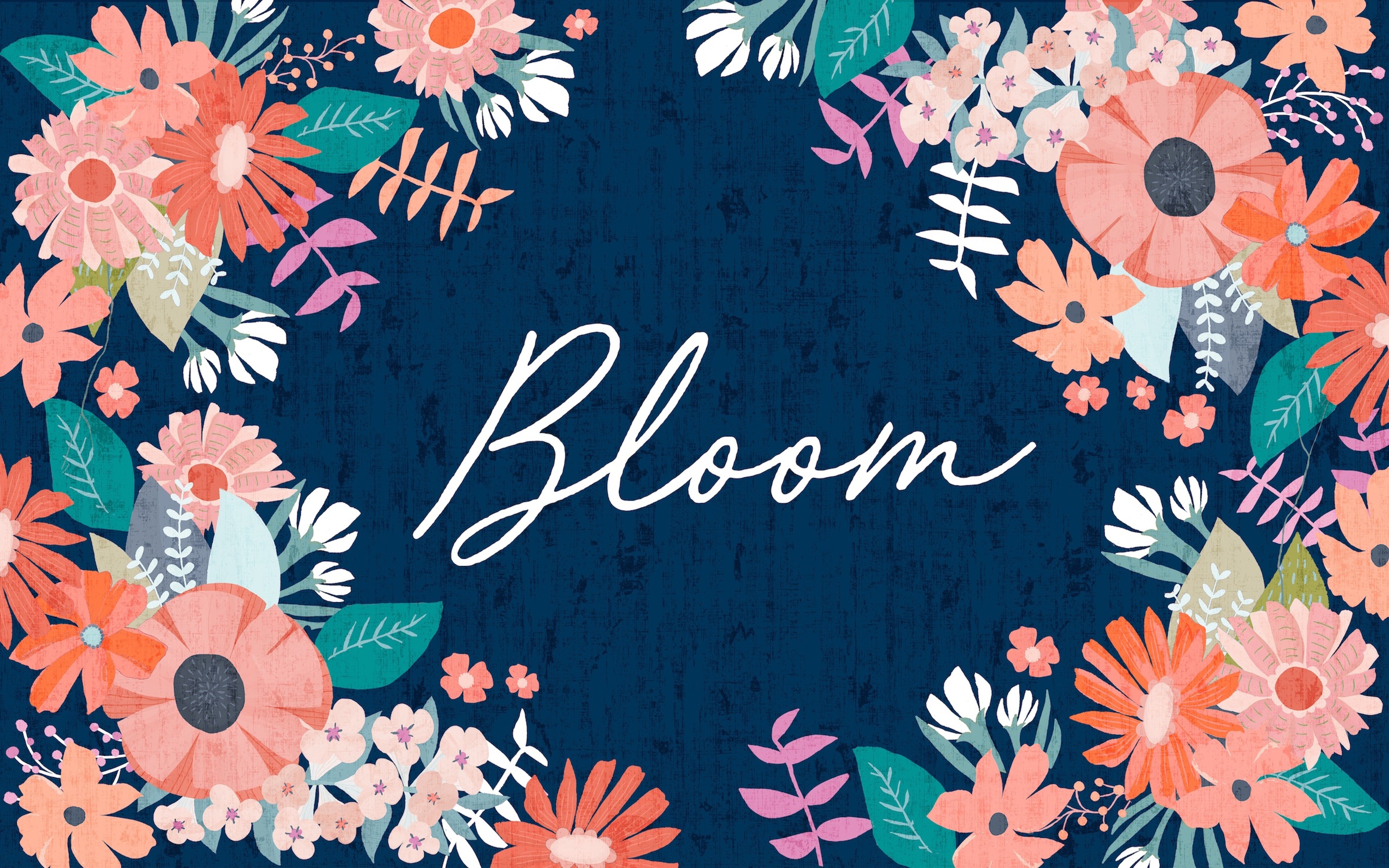 Vibrant Floral Kitchen Rug: Features a cheerful, stylized floral border and the script word "Bloom".