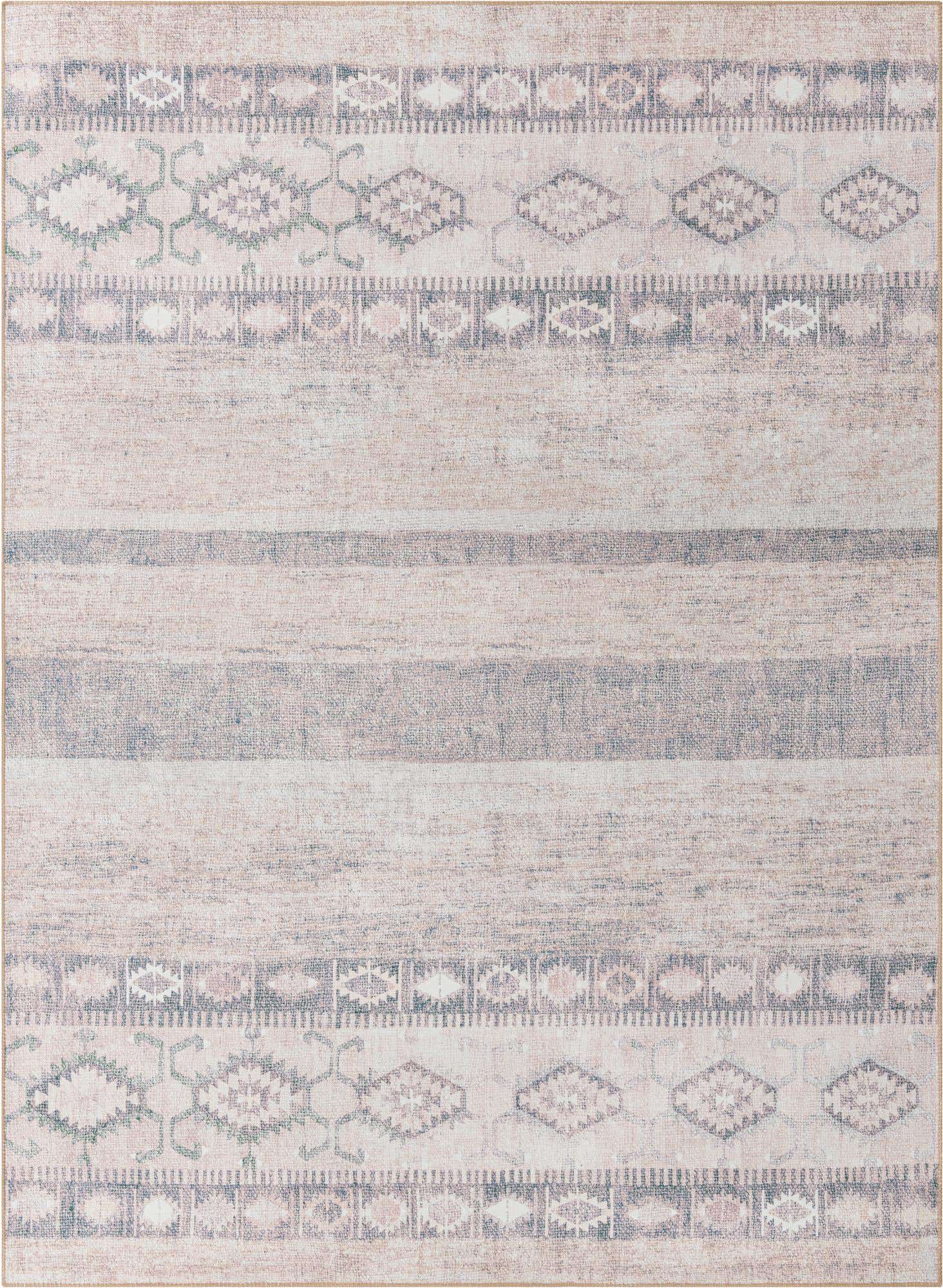 Product Description Introduce soft texture and understated global style with our Distressed Neutral Tribal Striped Rug. This piece features a design composed of broad horizontal bands, separated by intricate, patterned stripes. The overall color palette is highly neutral and faded, dominated by soft beige, cream, and dusty rose/mauve. The pattern is intentionally distressed and blurred to give it a vintage, aged appearance. Narrower bands feature detailed tribal diamond and geometric motifs rendered in soft muted grey, pale blue, and dusty pink. The look is a sophisticated blend of traditional ethnic pattern with contemporary distressing.