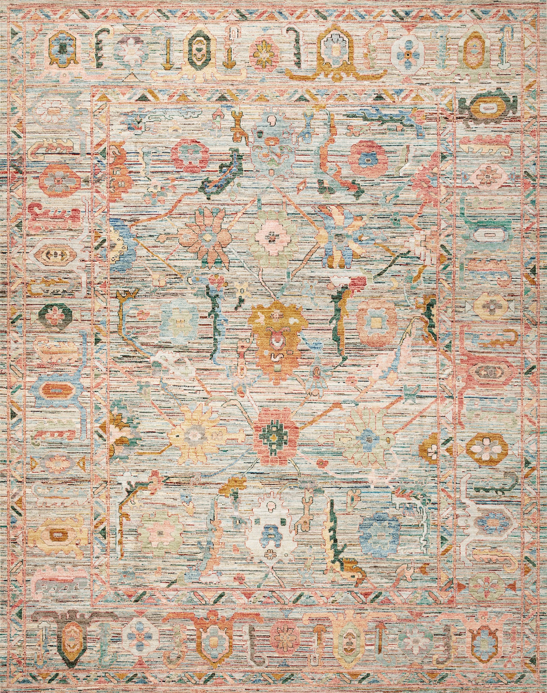 Why You Should Buy The Pastel Aqua Textured Oushak Rug is perfect for adding light color and high visual texture to transitional, bohemian, or cottage-style rooms. The distressed, multi-tonal nature of the rug provides depth while being incredibly forgiving in high-traffic areas. The soft, multi-colored palette allows it to integrate seamlessly with a variety of furniture and wall colors.