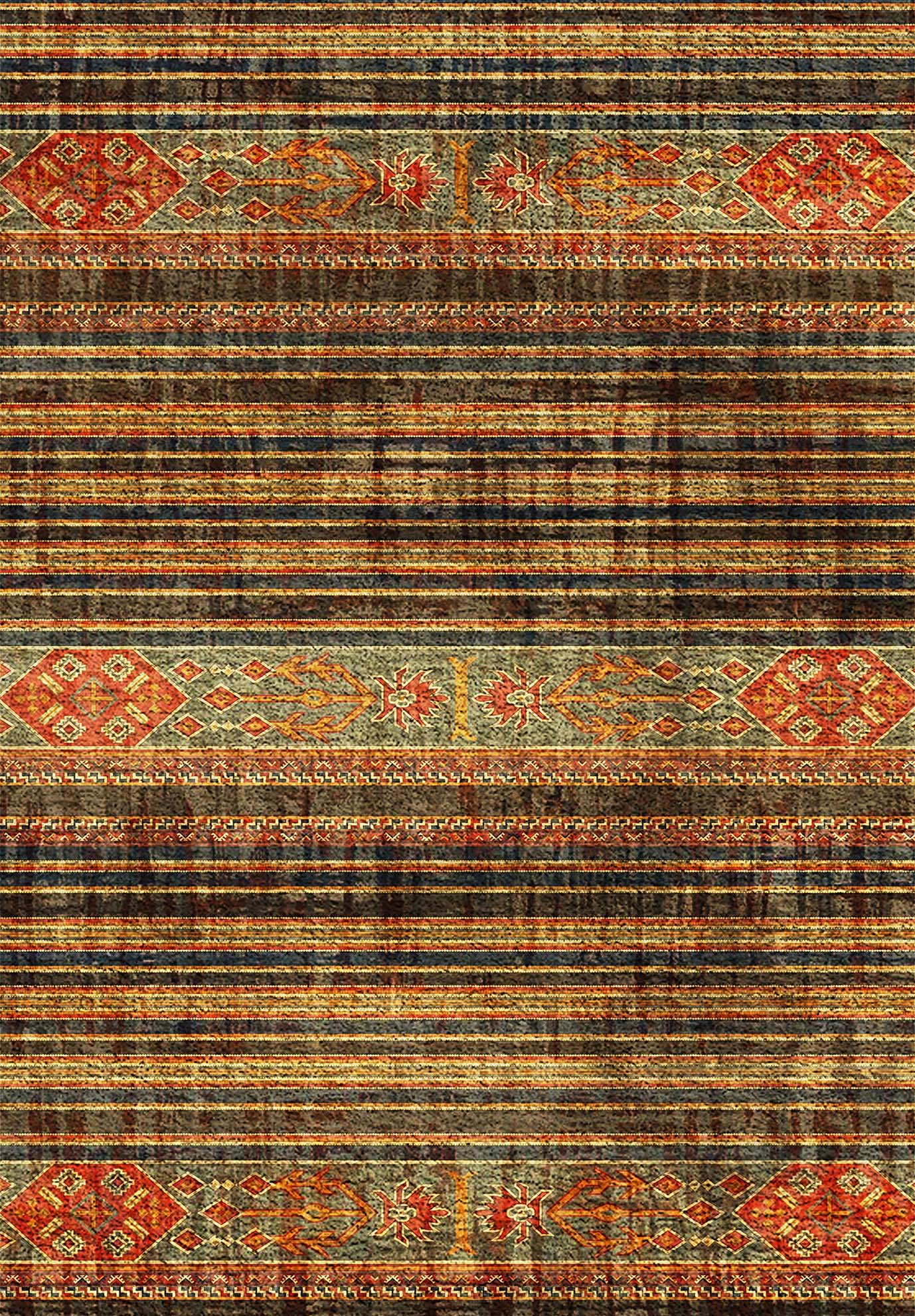 Product Description Introduce the spirit of the desert and ancient craftsmanship with our Sahara Sunset Kilim. This exquisite flatweave features a rich tapestry of earthy tones, dominated by deep terracotta, burnt orange, mustard yellow, and anchoring charcoal greys. The design utilizes horizontal stripes interspersed with bold geometric medallion borders, creating a striking, authentic tribal aesthetic. Woven using modern flat-weave technology, this Kilim is intentionally finished with a subtle, distressed effect to evoke the timeless charm of a treasured antique. It's the perfect statement piece for adding warmth, texture, and a global, rustic flair to any room.