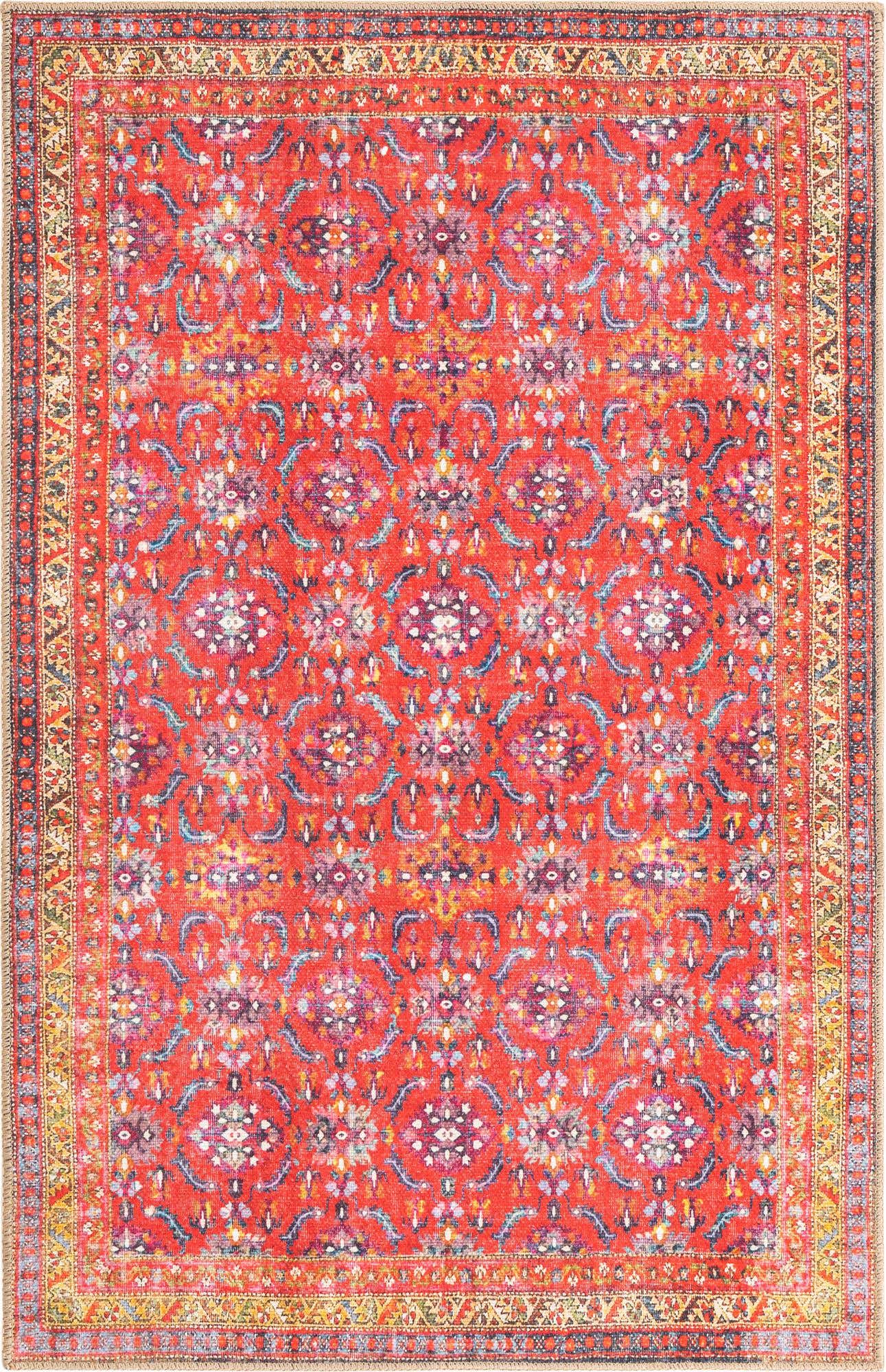 Product Description Anchor your space with the bold, saturated color and delicate pattern of our Vintage Vibrant Red Floral Rug. This piece features an intricate all-over field pattern composed of repeating stylized floral medallions and vine motifs. The design is enclosed by a thin, complex multi-layered border that features geometric and miniature floral details. The dominant color is a striking, bright crimson or fiery red, with the floral patterns rendered in contrasting tones of deep indigo blue, turquoise, purple, and yellow/gold. The overall appearance is intentionally faded or distressed to give it the character of an antique piece.